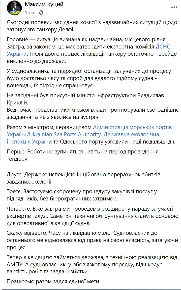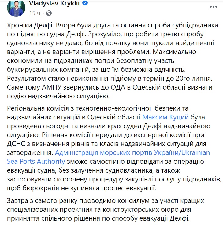 Регіональна комісія з техногенно-екологічної безпеки та надзвичайних ситуацій в Одеській області визнала крах судна Delfi надзвичайною ситуацією.