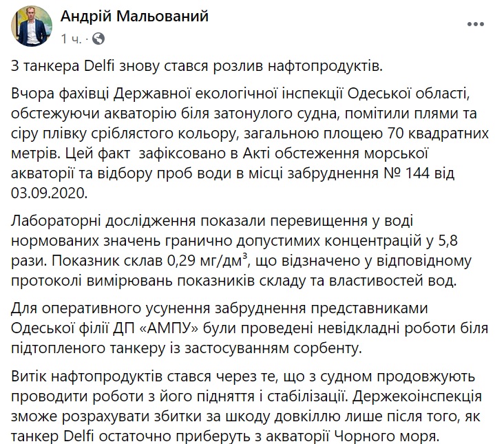 «Для оперативного усунення забруднення представниками Одеської філії ДП «АМПУ» були проведені невідкладні роботи біля підтопленого танкеру із застосуванням сорбенту. Витік нафтопродуктів стався через те, що з судном продовжують проводити роботи з його підняття і стабілізації. Держекоінспекція зможе розрахувати збитки за шкоду довкіллю лише після того, як танкер Delfi остаточно приберуть з акваторії Чорного моря», - написав голова екоінспекції.