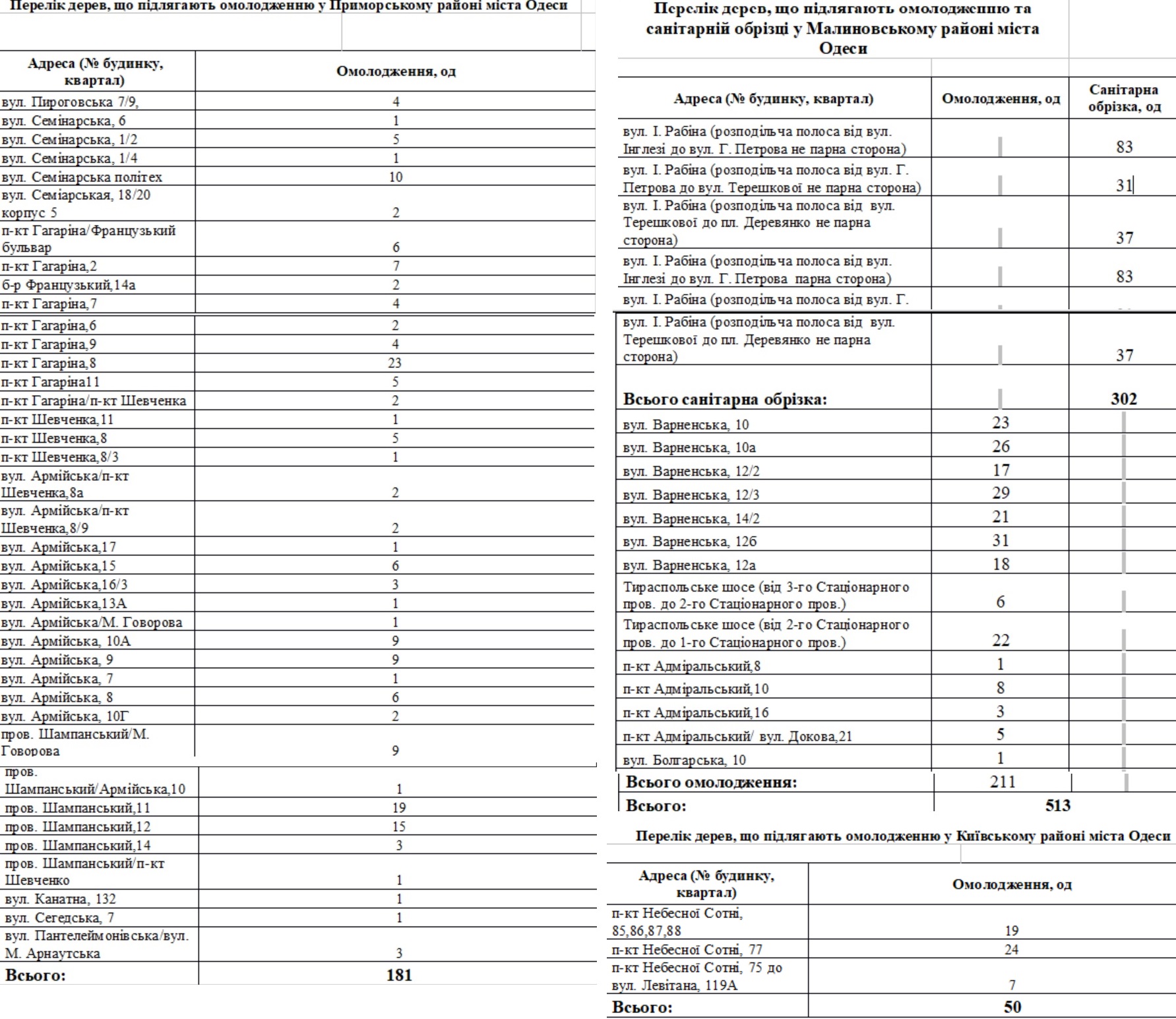 Згідно системи аукціони із загальною вартістю закупівлі в 4 мільйони 997,4 тисяч гривень відбудуться 20 жовтня: в Малиновскому районі омолодженню та санітарній обрізці підлягають 513 дерев за 2 мільйони 740,3 тисяч гривень, в Київському омолодять 50 за 489,9 тисяч гривень, а в Приморському омолодять 181 дерево за 1 мільйон 767,2 тисяч гривень.