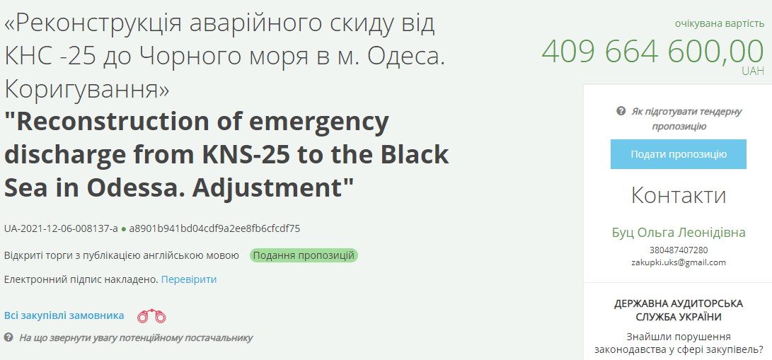 Реконструкція аварійного скиду від каналізаційно-насосної станції (КНС) № 25 до Чорного моря коштуватиме 409,6 млн гривень, а ділянка від Хаджибейського лимана до КНС - 230 млн гривень.