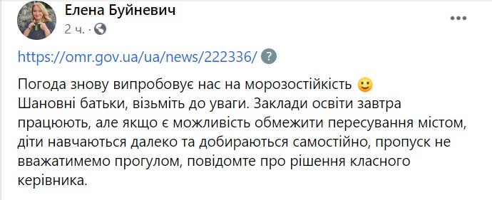 "Погода знову випробовує нас на морозостійкість. Шановні батьки, візьміть до уваги. Заклади освіти завтра працюють, але якщо є можливість обмежити пересування містом, діти навчаються далеко та добираються самостійно, пропуск не вважатимемо прогулом, повідомте про рішення класного керівника", - написала вона на своїй сторінці в Facebook.
