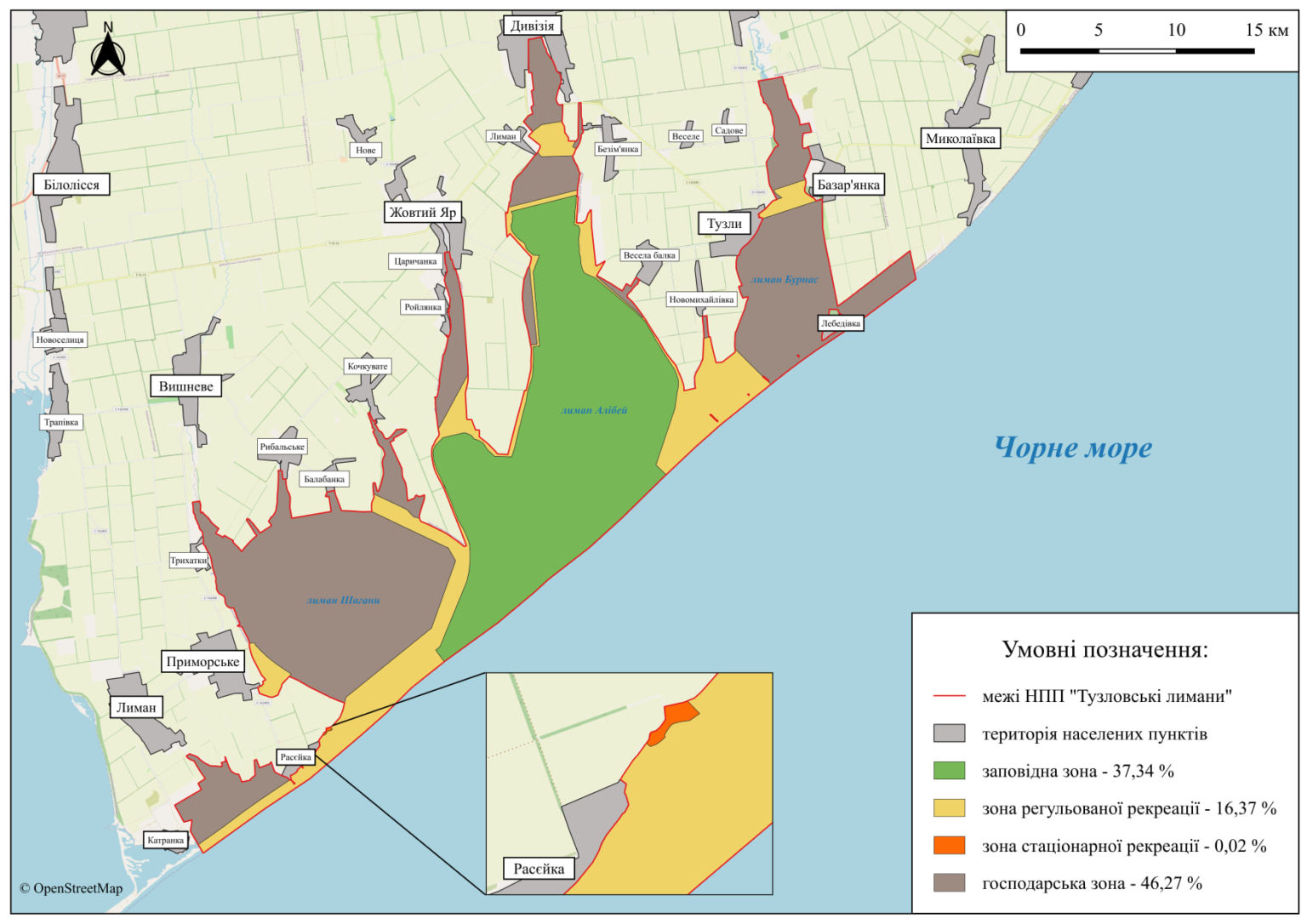 У межі села потрапили, зокрема, землі державної власності, що знаходяться на території Національного природного парку "Тузлівські лимани": акваторії лиману Малий Сасик, частини території Піщаного пересипу (29-31 км), ділянки прибережної захисної смуги лиману Малий Сасик біля курортної зони Расєйка.