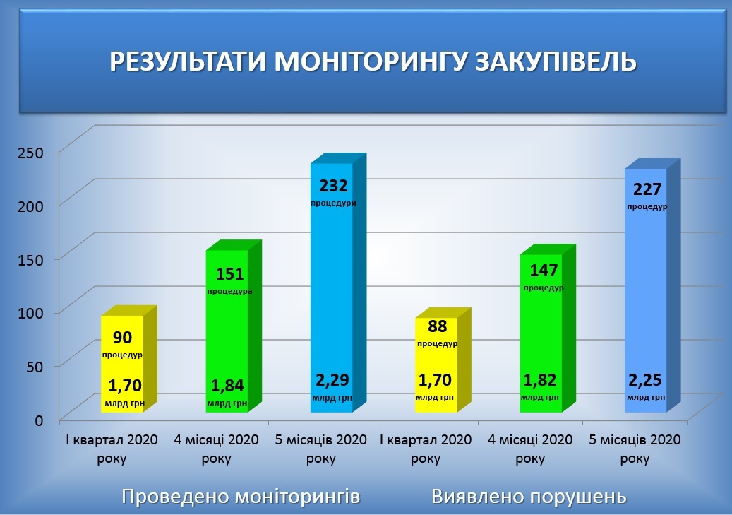 Під час моніторингу аудитори попередили укладання договорів та здійснення витрат коштів за процедурами закупівель, проведених з порушенням законодавства, на понад 1,1 млрд грн. З них відмінено 56 закупівель загальною очікуваною вартістю 1,1 млрд грн, розірвано договорів за 14 процедурами закупівель на понад 21 млн грн.