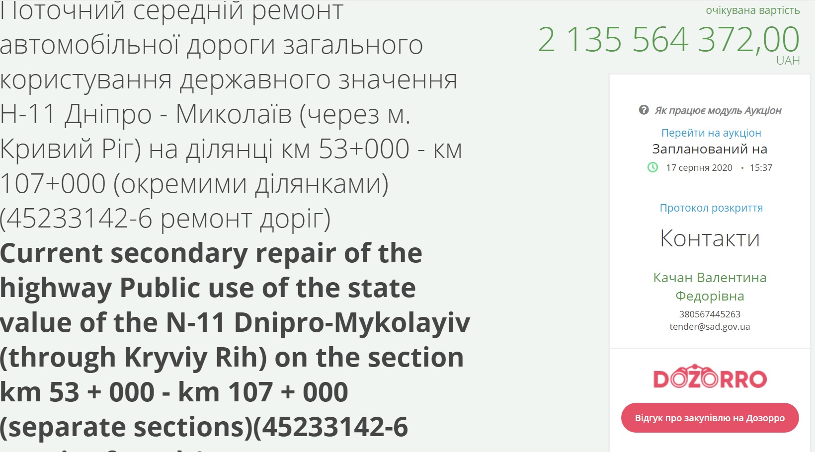 Згідно з даними системи, аукціон з очікуваною вартістю закупівлі в 2 мільярди 135,5 мільйонів гривень має відбутися 17 серпня і єдиними учасниками в ньому будуть ТОВ «Ростдорстрой» та ТОВ «Автомагістраль-південь».
