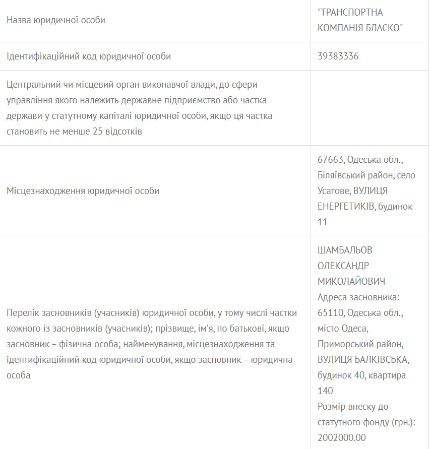 Ще 174,2 тисячі гривень мають виплатити Товариству з обмеженою відповідальністю «Транспортна компанія Бласко», що заснована у 2017 році Олександром Шамбальовим, який є також директором цієї кампанії. Основним видом діяльності ТОВ є вантажний автомобільний транспорт, однако також воно займається технічним обслуговуванням та ремонтом автотранспортних засобів, оптовою торгівлею твердим, рідким, газоподібним паливом і подібними продуктами тощо.