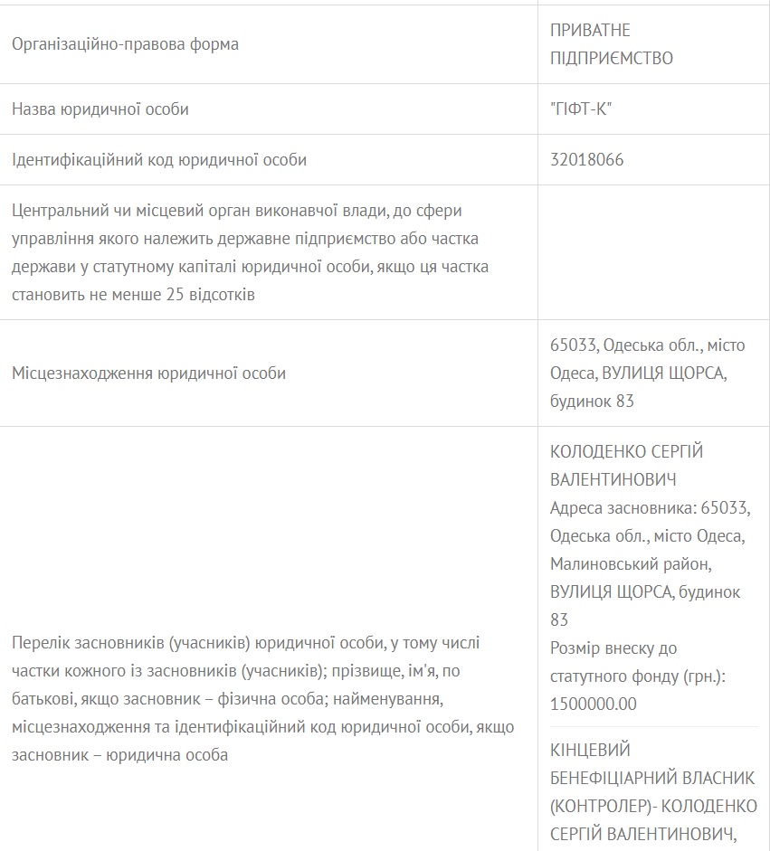 116,7 тисяч гривень компенсують приватному підприємству «Гіфт-К», заснованому у 2005 році Сергіем Колоденком. Основним видом діяльності цієї компанії є виробництво гофрованого паперу та картону, паперової та картонної тари.