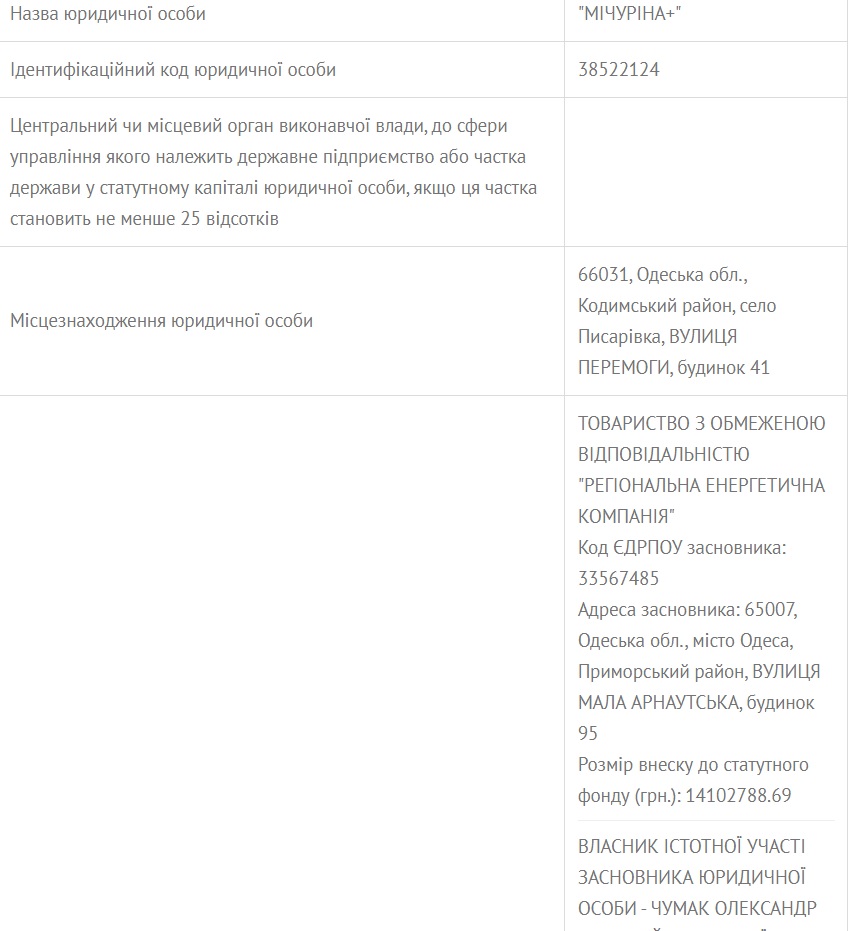Нарешті 25,6 тисяч гривень компенсують ТОВ «Мічурина+». Засноване у 2014 році Товариством з обмеженою відповідальністю «Регіональна енергетична компанія». Кінцеві бенефіціари - Ганна та Олександр Чумаки. Основним видом діяльності компанії є вирощування зернових культур (крім рису), бобових культур і насіння олійних культур. Але також компанія займається тваринництвом, оптовою торгівлею зерном, необробленим тютюном, насінням і кормами для тварин, та наданням в оренду й експлуатацію власного чи орендованого нерухомого майна.