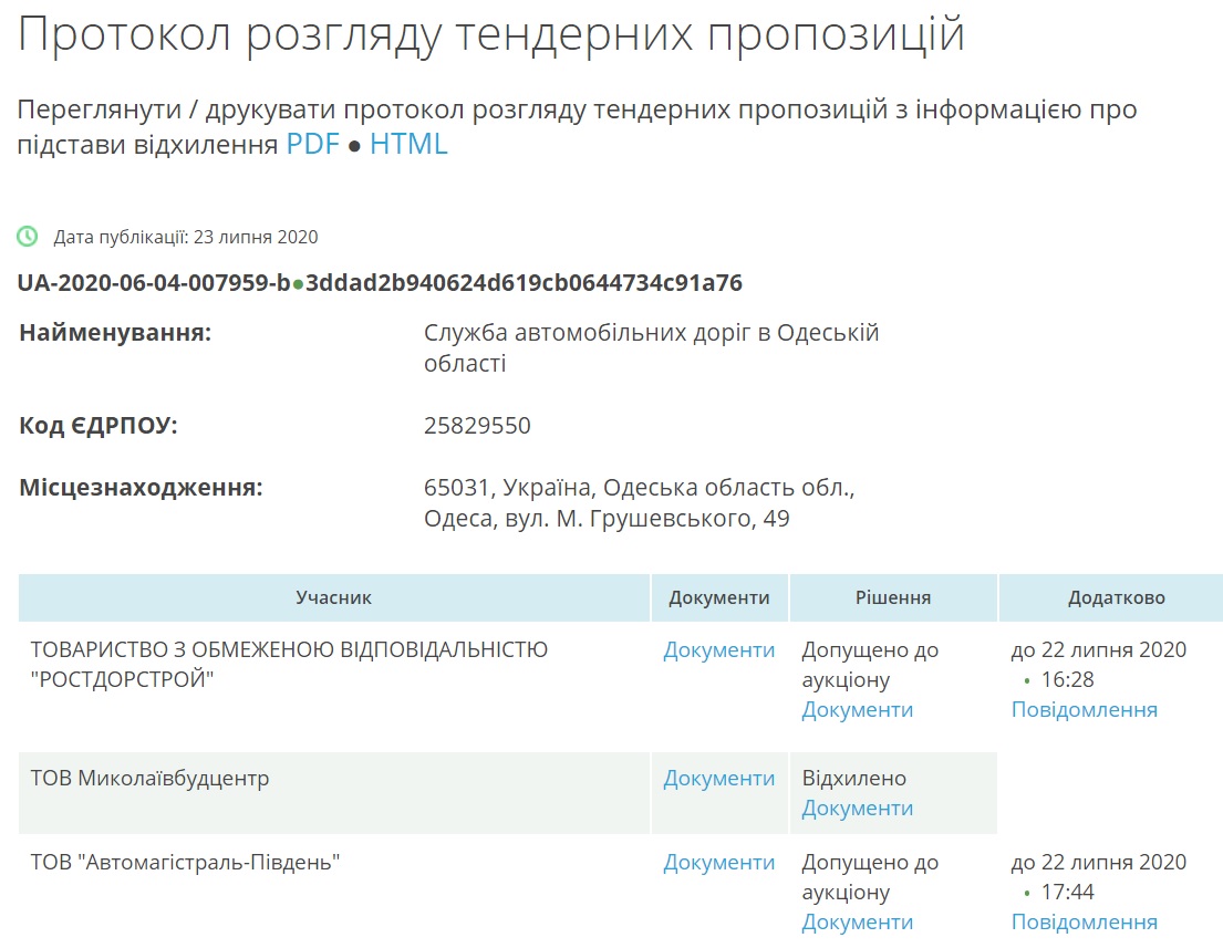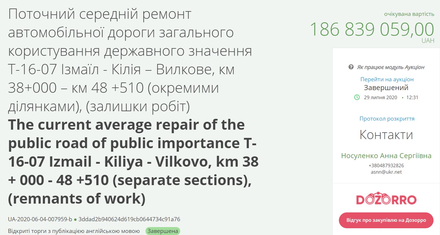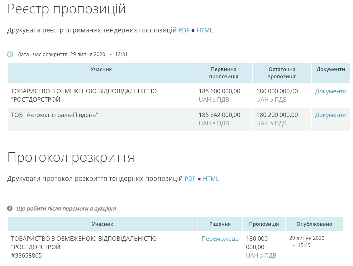 Угоду з ТОВ «Ростдорстрой» уклали ще 20 серпня, а аукціон відбувся 29 липня. В ньому взяли участь дві компанії: власне ТОВ «Ростдорстрой», а також ТОВ «Автомагістраль-Південь». ТОВ «Ростдорстрой» погодилося зробити ремонт за 180 мільйонів гривень. Конкурент просив на 200 тисяч більше.