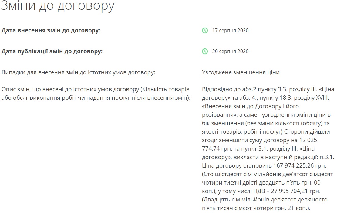 Однак пізніше замовник та підрядник узгодили зменшення ціни до 167 мільйонів 974, 2 тисяч гривень.