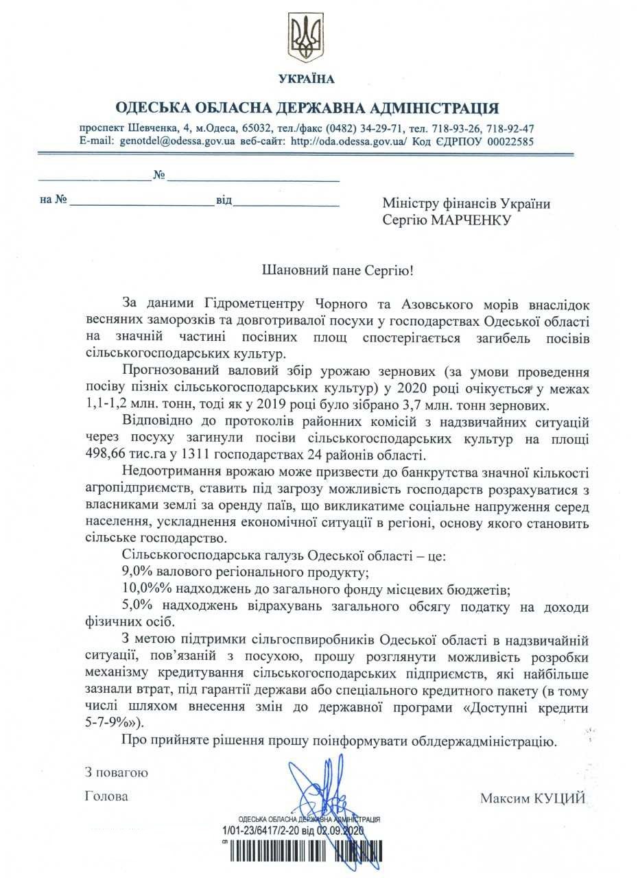 Голова обласної державної адміністрації Максим Куций звернувся до Міністра фінансів України Сергія Марченка з проханням розглянути можливість розробки механізму кредитування сільськогосподарських підприємств, які найбільше зазнали втрат, під гарантії держави або спеціального кредитного пакету (зокрема шляхом внесення змін до державної програми «Доступні кредити 5-7-9%»).
