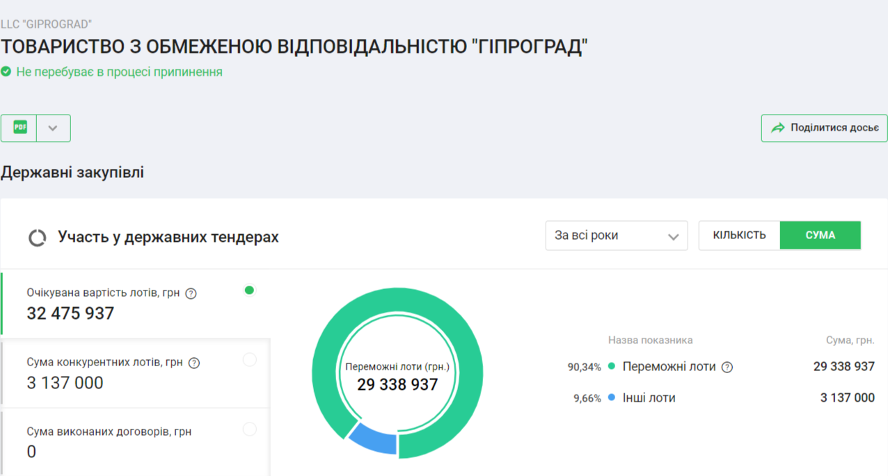 Компанія неодноразово брала участь у тендерх на розробку документації, які оголошувало управління капітального будівництва Одеської міськради. За даними системи YouControl, на тендерах компнаії вдалося заробити майже 30 мільйонів гривень.