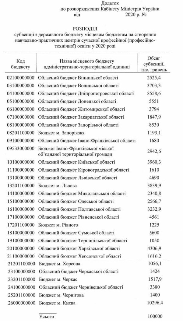 Кабінет міністрів України виділив 100 мільйонів гривень субвенцій з державного бюджету місцевим бюджетам на створення навчально-практичних центрів сучасної професійної (професійно-технічної) освіти у 2020 році.
