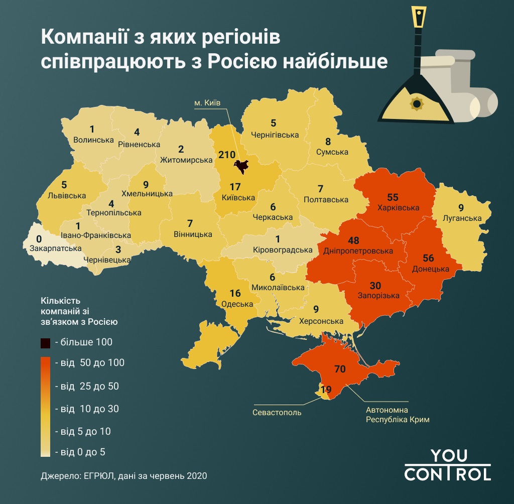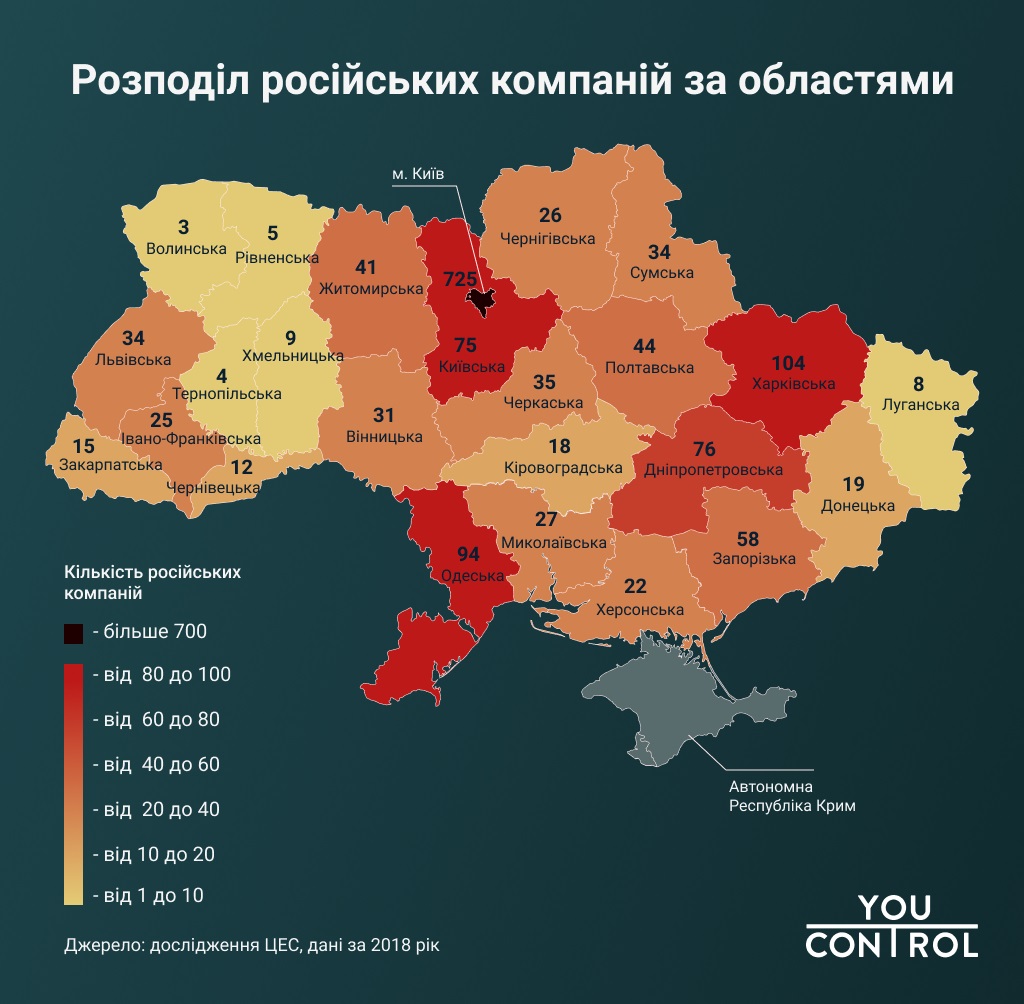 Спираючись на дані дослідження Центру економічної стратегії, експерти сервісу YouControl порахували присутність російських компаній в областях України.