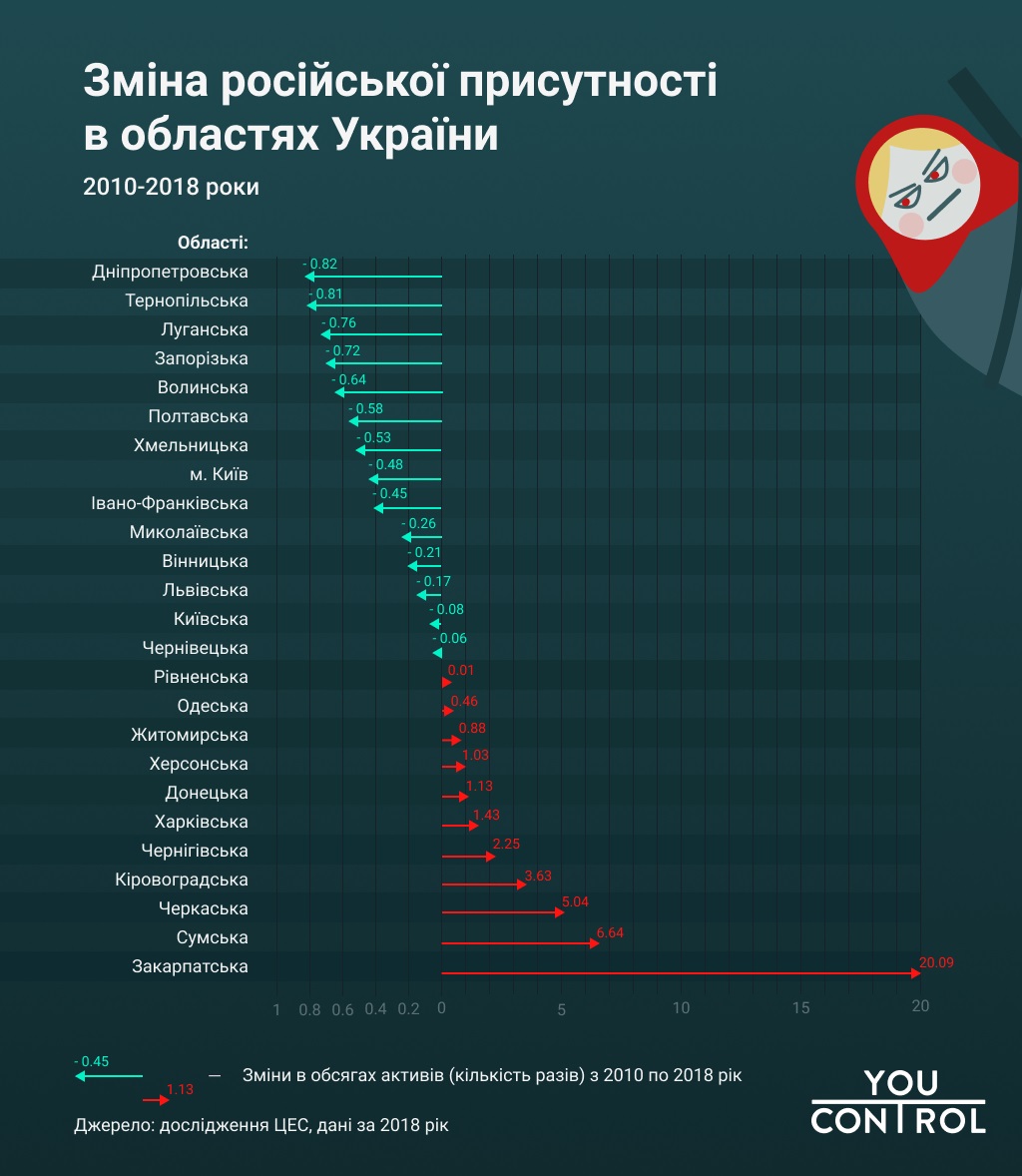 За останні 10 років російська присутність на Західній Україні впала, окрім Закарпатської області, де вона зросла найбільше по країні. Також серед областей, де зафіксоване збільшення компаній, що належать Росії, Сумська, Черкаська, Кіровоградська та Чернігівська області. Але це не обов’язково свідчить про систематичне збільшення російської присутності: наприклад, в Закарпатській та Черкаській областях ключовим чинником було придбання російською компанією місцевого обленерго.