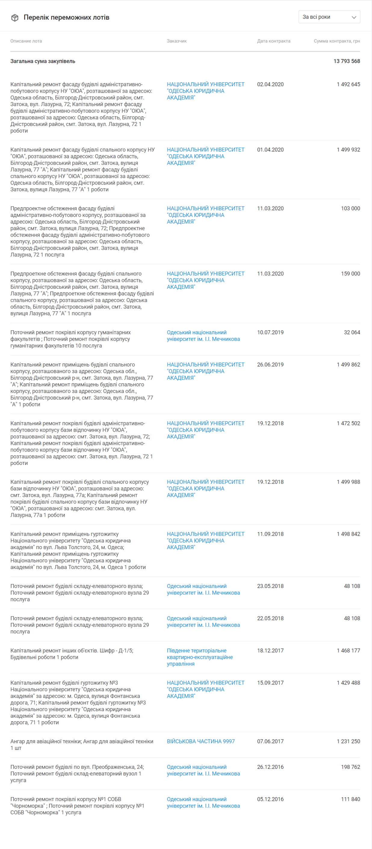 Наприкінці 2018-го це ж ТОВ виконувало укладало договори на капремонт приміщень її спального корпусу та покрівлі будівлі адміністративно-побутового корпусу бази відпочинку, розташованої у Затоці, а також приміщень гуртожитку в Одесі та інші.