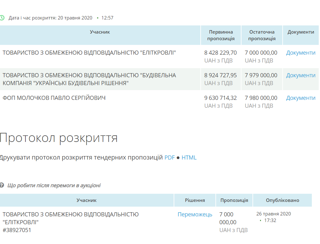 Результати аукціону стали відомі ще наприкінці травня, а 15 червня навчальний заклад уклав договір з ТОВ "Еліткровлі", 19 червня був опублікований протокол засідання та додаткові угоди між замовником та виконавцем. Про це повідомляється у системі закупівель Prozorro.