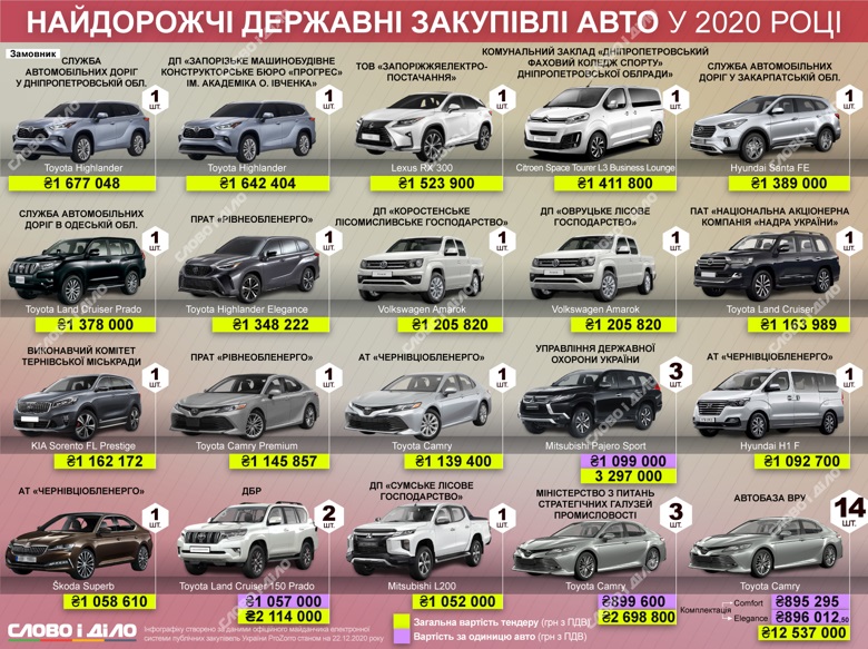 Віддають перевагу Toyota Highlander у Службі автомобільних доріг у Дніпропетровській області та Запорізькому машинобудівному конструкторському бюро «Прогрес». Ці держустанови закупили по одній іномарці, які коштували бюджету понад 1,6 млн кожна.