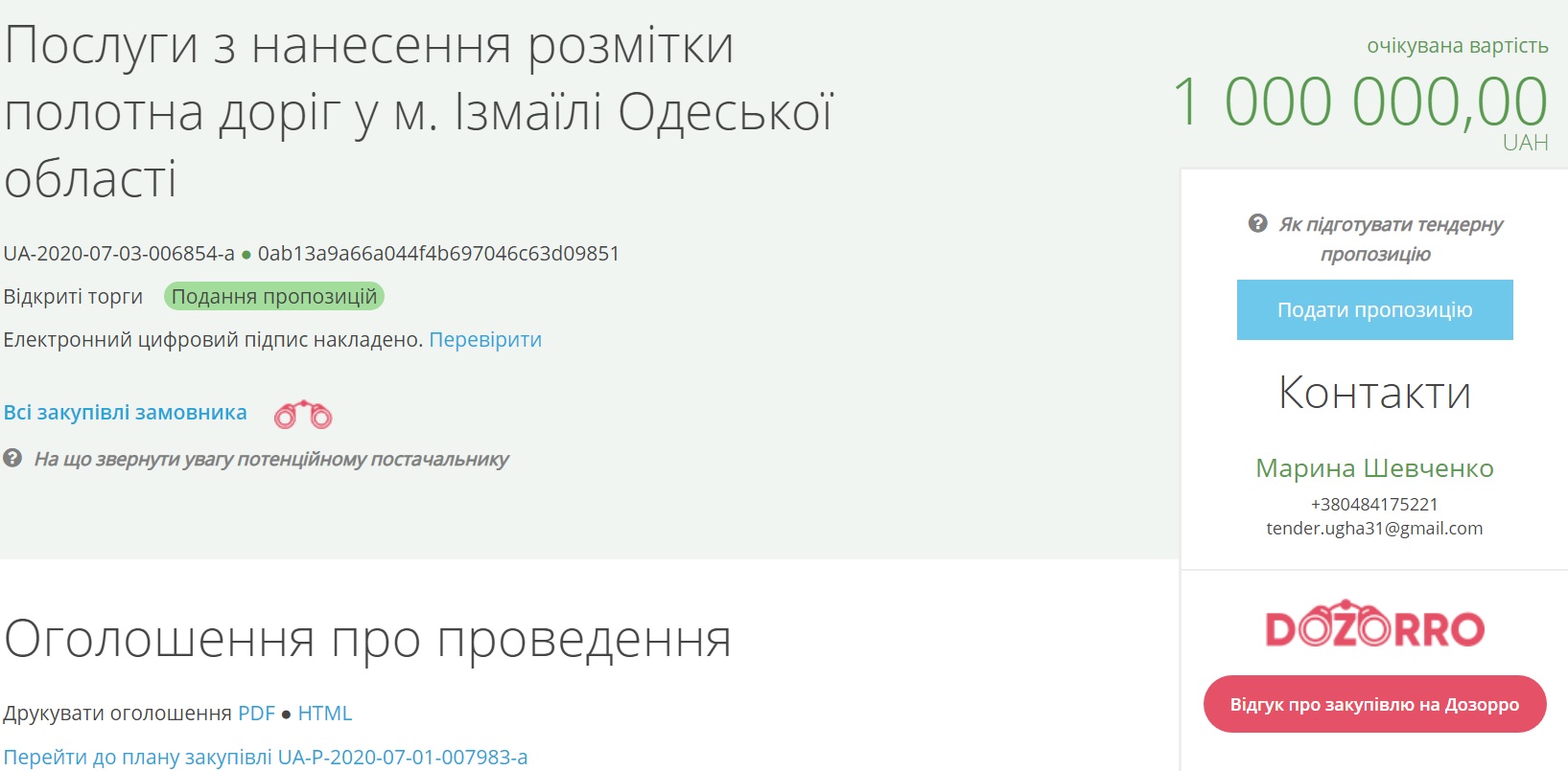 За даними системи, аукціон з очікуваною вартістю закупівлі в 1 мільйон має відбутися 20 липня. Строк надання послуг - 24 грудня.