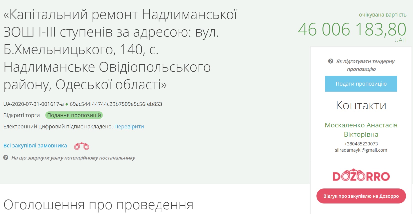 Управління містобудування, архітектури, землевпорядкування, житлово –комунального господарства та комунальної власності Маяківської сільської ради оголосило тендер для вибору підрядника, якому заплатять за капітальний ремонт школи у селі Надлиманське Овідіопольського району, Одеської області.