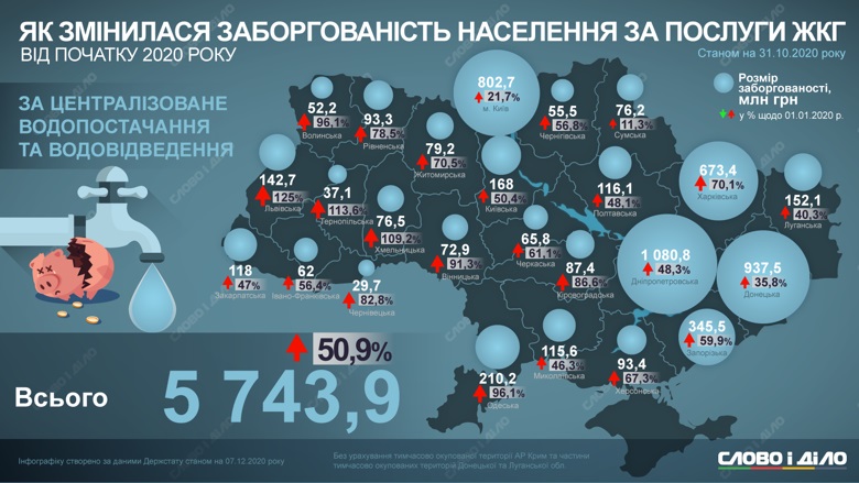 Порівняно із січнем майже на 51% зріс борг населення за централізоване водопостачання і водовідведення. Наприкінці січня сума перевищувала 5,7 млрд грн. Крім того, до 5,1 млрд грн (на 14,5%) зросла заборгованість за управління багатоквартирним будинком. Найбільше за цю послугу не сплатили в Києві і Дніпропетровській області. Тут заборгованість в Одеській області зросла на 96,1%.