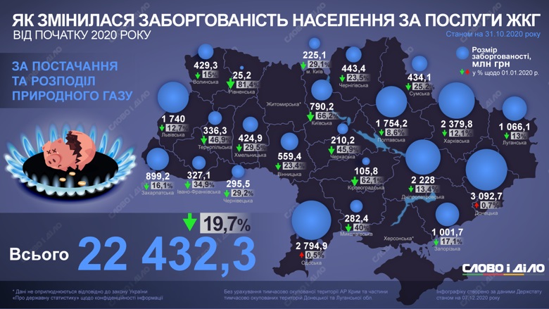 Традиційно найбільші борги у населення накопичилися за споживання і розподіл природного газу. Щоправда, із початку року борг скоротився на 19,7% і становить 22,4 млрд грн. Найбільша заборгованість у жителів Донецької області – більше 3 млрд, а також в Одеській, Харківській, Полтавській, Львівській, Луганській та Запорізькій областях.
