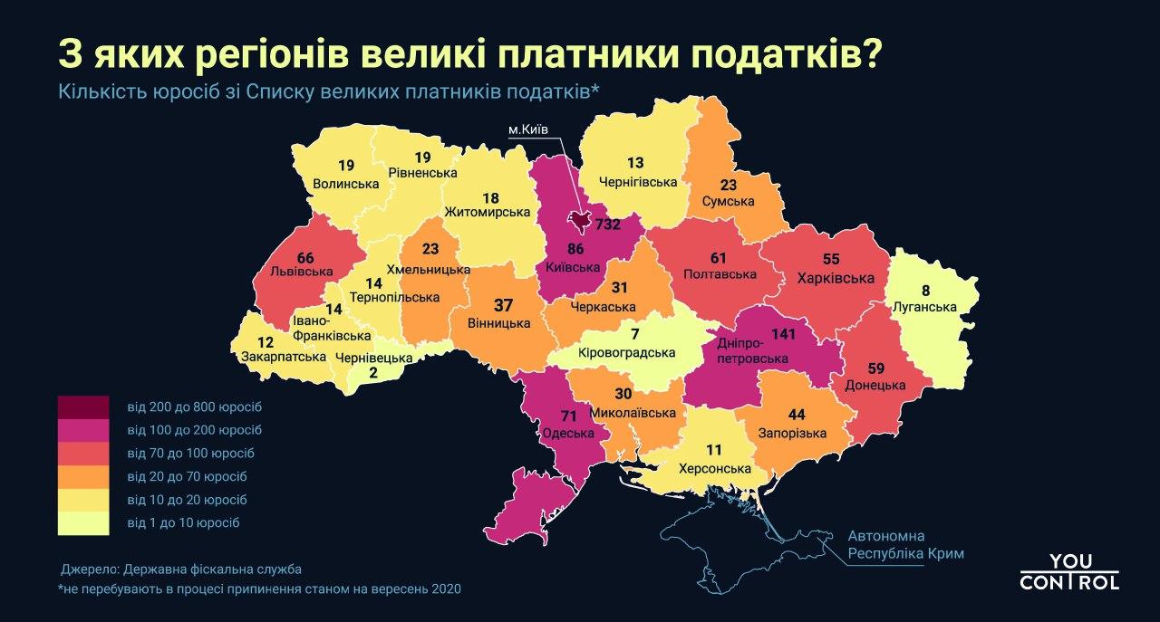 З великим відривом як від столиці, так і від третього місця, йде Дніпропетровська область, яка є місцем прописки 141 юрособи. «Бронза» дісталась Київський області з 86 юрособами. П'ятірку замикають Одеська та Львівська області з 71 та 66 компаніями відповідно. Варто також зауважити, що 15 юросіб зі списку великих платників податків є філіями «Укрзалізниці» або іноземних компаній.