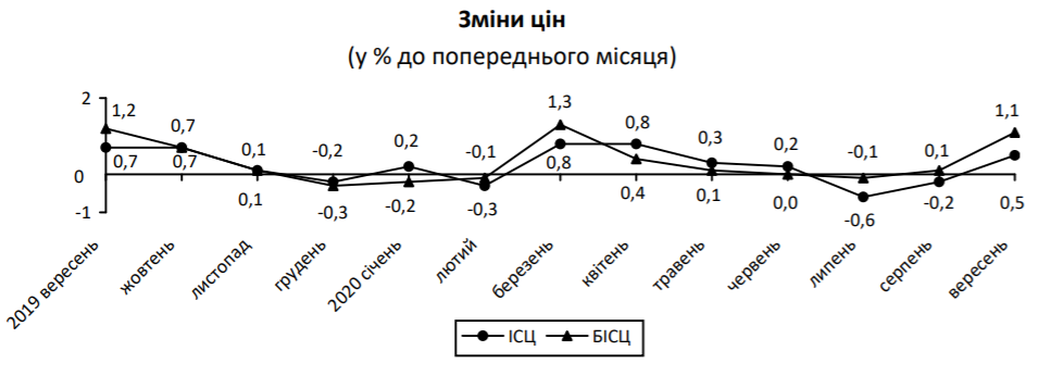 Інфляція на споживчому ринку у вересні 2020 р. порівняно із серпнем 2020 р. становила 0,5%, з початку року – 1,7%. Базова інфляція у вересні 2020 р. порівняно із серпнем 2020 р. становила 1,1%, з початку року – 2,6%.