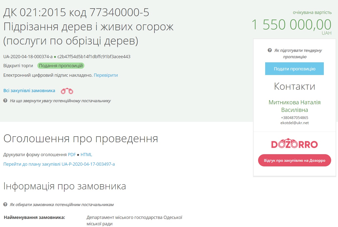 Департамент міського господарства Одеської міської ради оголосив тендер щоб вибрати компанію якій заплатить за послуги по підрізанню дерев.