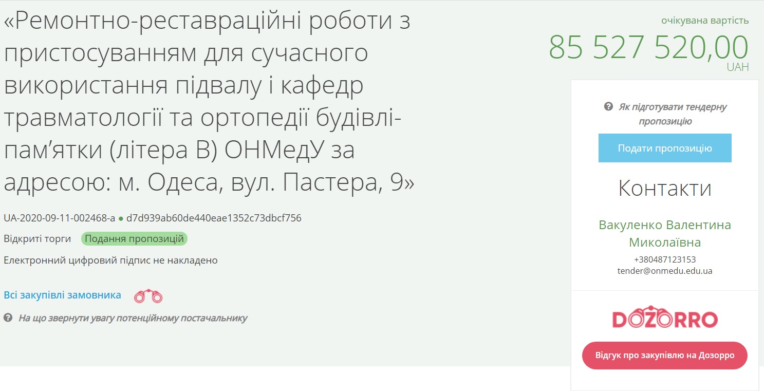Одеський національний медичний університет оголосив тендер для вибору підрядника, якому заплатят за ремонтно-реставраційні роботи з пристосуванням для сучасного використання підвалу і кафедр травматології та ортопедії будівлі-пам’ятки.
