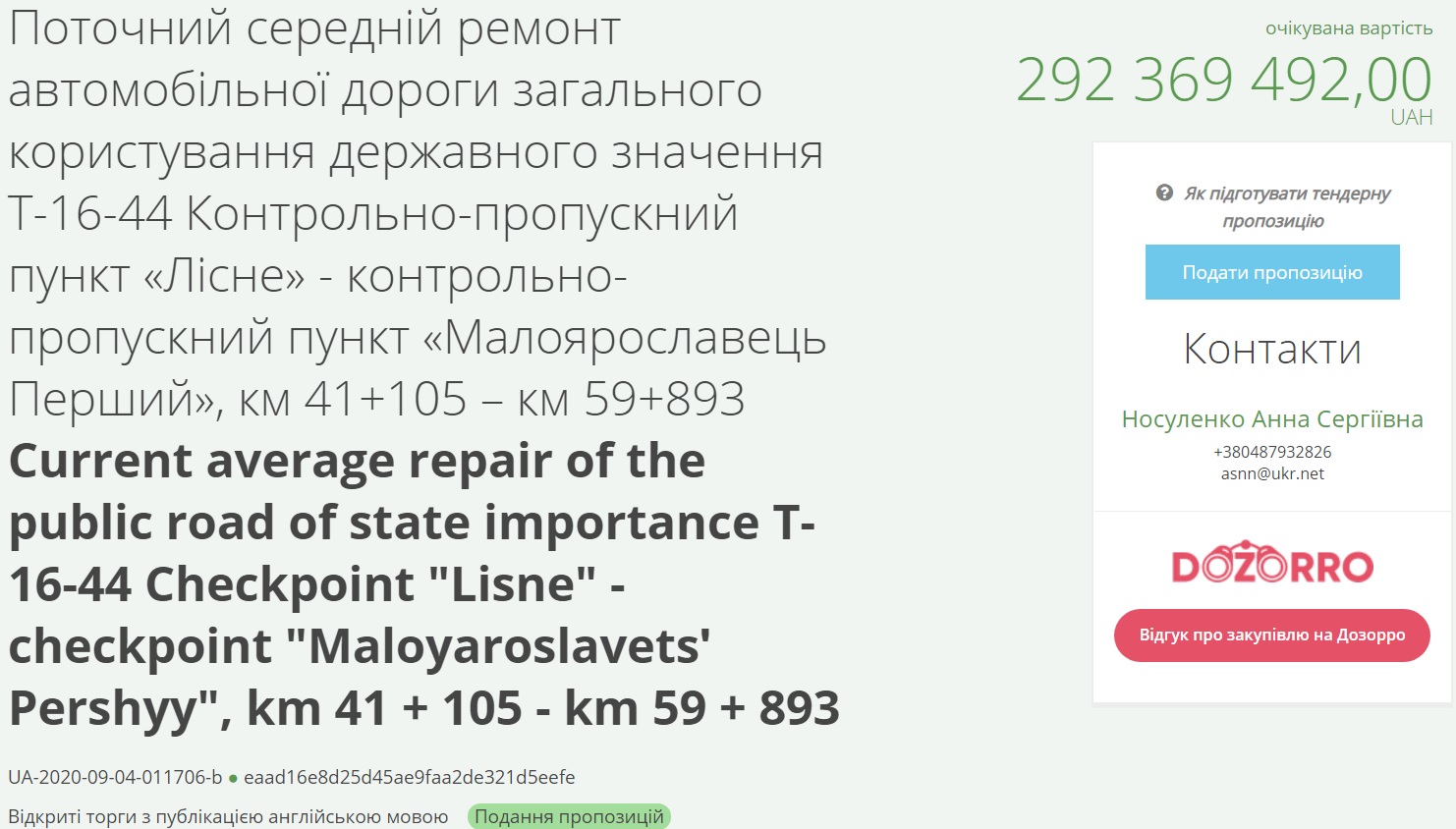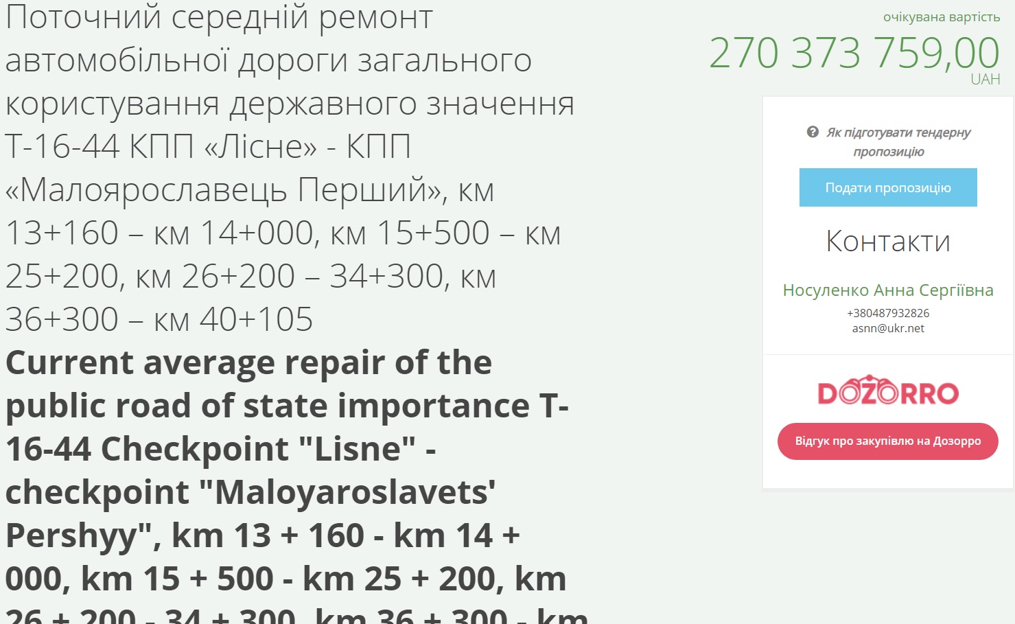 Згідно системи, йдеться про ремонт 41,2 кілометра дороги окремими ділянками. В першім тендері 18,8 кілометрів дороги пропонується відремонтувати за 270 мільйонів 373,8 тисячі гривень, а в другому 22,4 кілометри за 292 мільйонів 369,5 тисяч гривень.