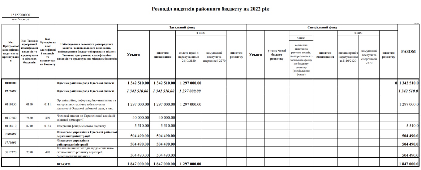 Наприклад, на членські внески до Європейської асоціації місцевої демократії витратять 40 тисяч гривень. Організаційне, інформаційно-аналітичне та матеріально-технічне забезпечення діяльності Одеської районної ради - 1 мільйон 297 тисяч.