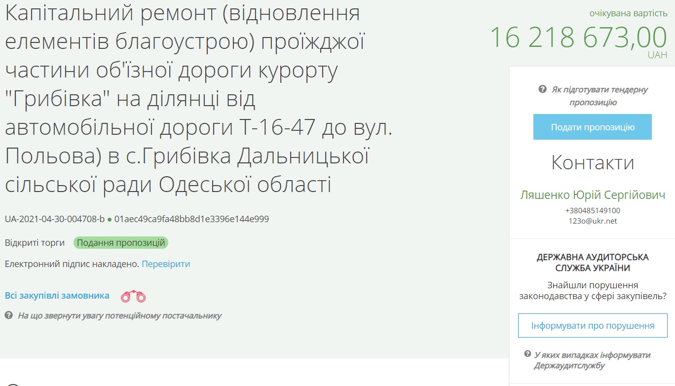 Дальницька сільська рада Овідіопольського району Одеської області оголосила тендер для пошуку компанії, якій заплатять за капітальний ремонт (відновлення елементів благоустрою) проїжджої частини об'їзної дороги курорту "Грибівка".