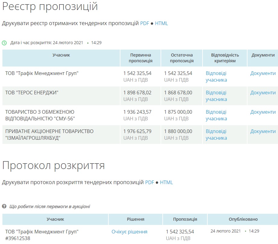 Переможцем визначили ТОВ "Трафік Менеджмент Груп", яке згодилося працювати за 1 мільйон 542,3 тисячі гривень. Компанія зареєстрована в 2015 році у Львові. Кінцеві бенефіціари - львівяни Остап Будинкевич та Евеліна Кульчицька.  Директор - Роман Сеник тезка депутата Одеської міської ради.