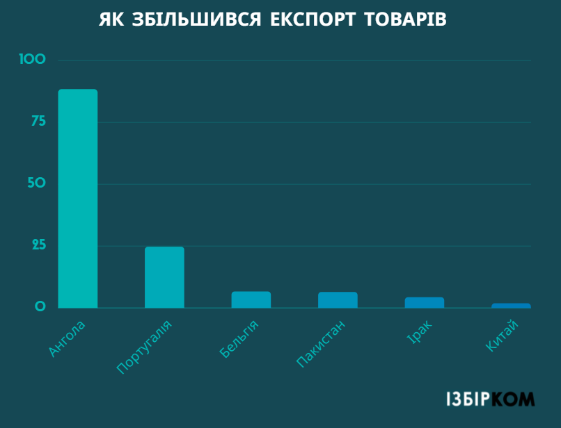 Серед найбільших країн–партнерів експорт товарів збільшився до Анголи – у 88,3 раза, Португалії – у 24,6 раза, Бельгії – у 6,5 раза, Пакистану – у 6,3 раза, Іраку – у 4,2 раза, Китаю – у 1,7 раза. Поряд з цим скоротилися поставки до Ірландія – на 96,4%, Лівії – на 83,7%, Танзанії – на 83,1%, Республіки Корея – на 79,4%, Малайзія – на 63,6%, Болгарії – на 46,9%, Туреччини – на 43,4%.
