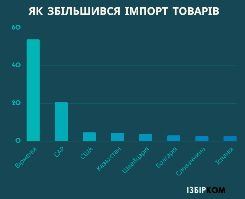 У січні–лютому 2021 р., порівняно з цим періодом минулого року, імпорт товарів серед найбільших країн-партнерів збільшився з Вірменії – у 53,9 раза, Сірійської Арабської Республіки – у 20,5 раза, США – у 4,6 раза, Казахстану – у 4,3 раза, Швейцарії – у 3,8 раза, Болгарії – у 3 рази, Словаччини та Іспанії – у 2,6 раза.
