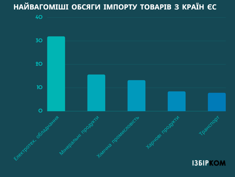 Найвагоміші обсяги імпорту товарів з країн ЄС складали: машини, обладнання та механізми; електротехнічне обладнання – 31,9%, мінеральні продукти – 15,6%, продукція хімічної та пов’язаних з нею галузей промисловості – 13,2%, готові харчові продукти – 8,4%, засоби наземного транспорту, літальні апарати, плавучі засоби – 7,8%.