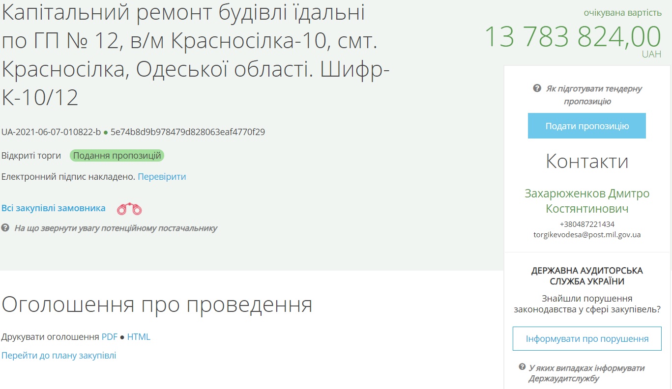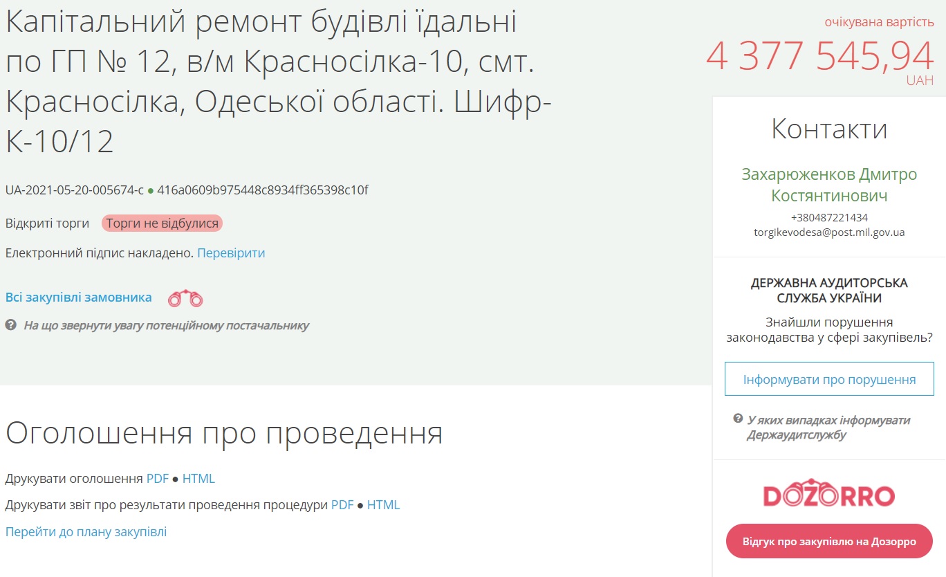 Квартирно-експлуатаційний відділ міста Одеса знов оголосив тендер для обрання компанії, якій заплатять за капітальний ремонт будівлі їдальні військового містечка Красносілка-10.