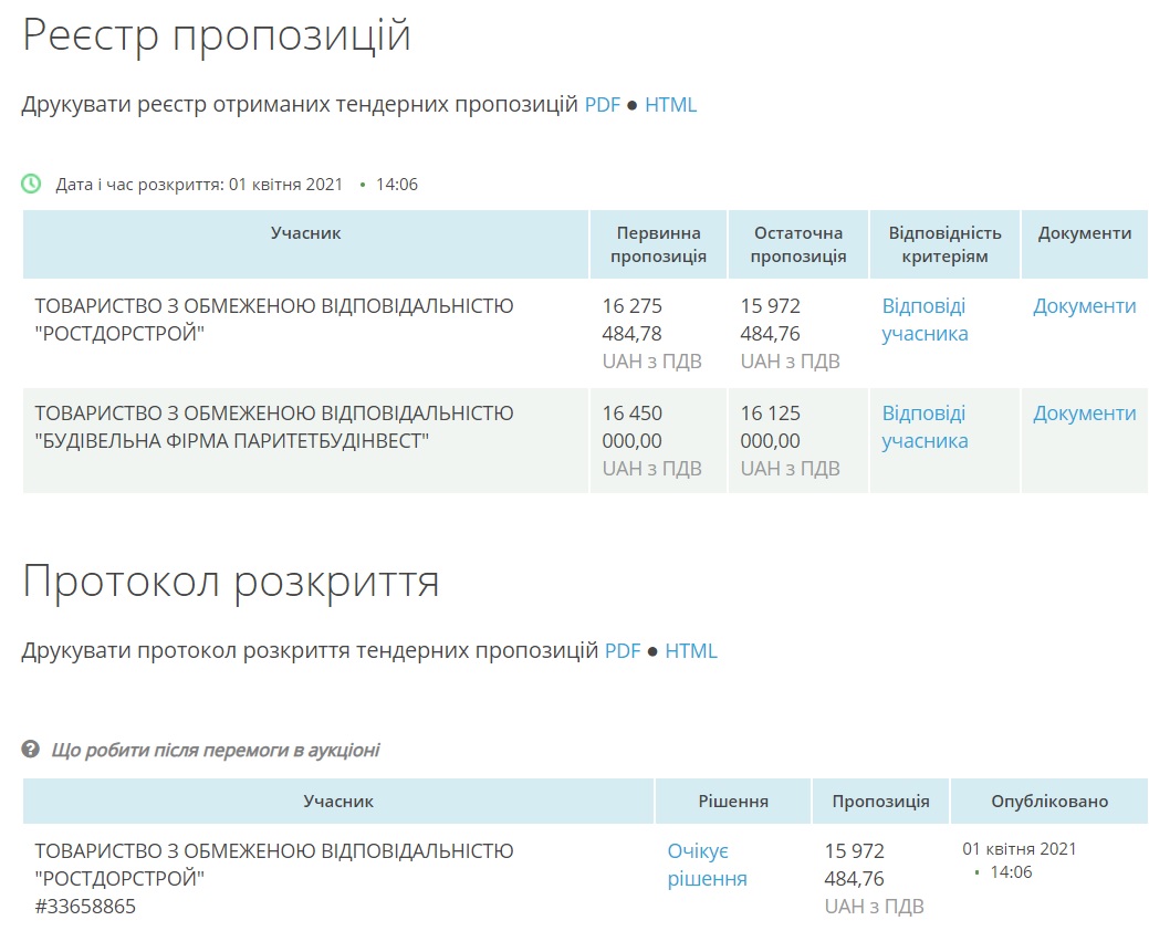 Згідно з даними системи, аукціон відбувся 1 квітня і єдиними учасниками стали ТОВ «Ростдорстрой» та ТОВ «Будівельна фірма "Паритетбудінвест"». В результаті переможцем визнали ТОВ «Ростдорстрой», яке зголосилося працювати за 15 мільйонів 972,5 тисяч гривень.