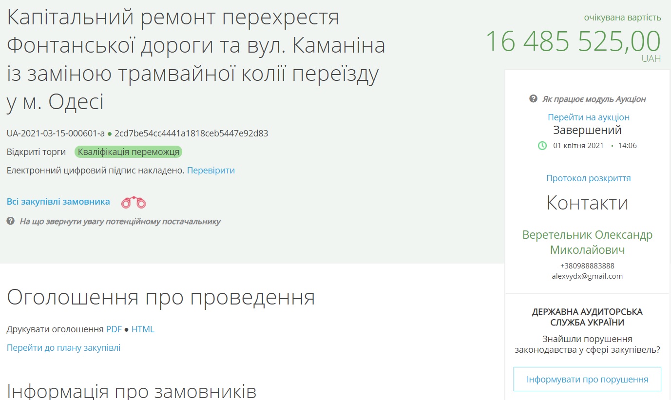 Управління дорожнього господарства Одеської міської ради провело тендер для обрання компанії, якій заплатить за капітальний ремонт перехрестя Фонтанської дороги та вул. Каманіна із заміною трамвайної колії переїзду у місті Одесі.