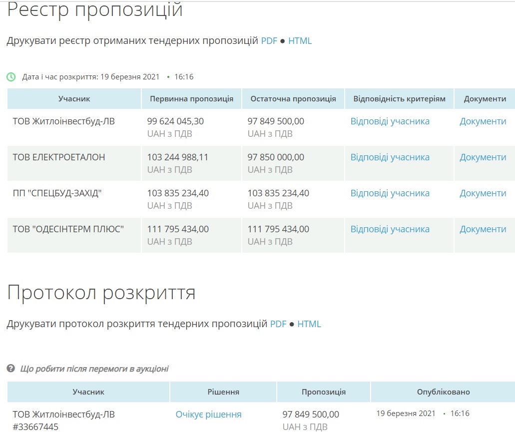 Аукціон з очікуваною вартістю закупівлі в 112 мільйонів 617,6 тисяч гривень відбувся 19 березня. В ньому взяли участь чотири компанії: