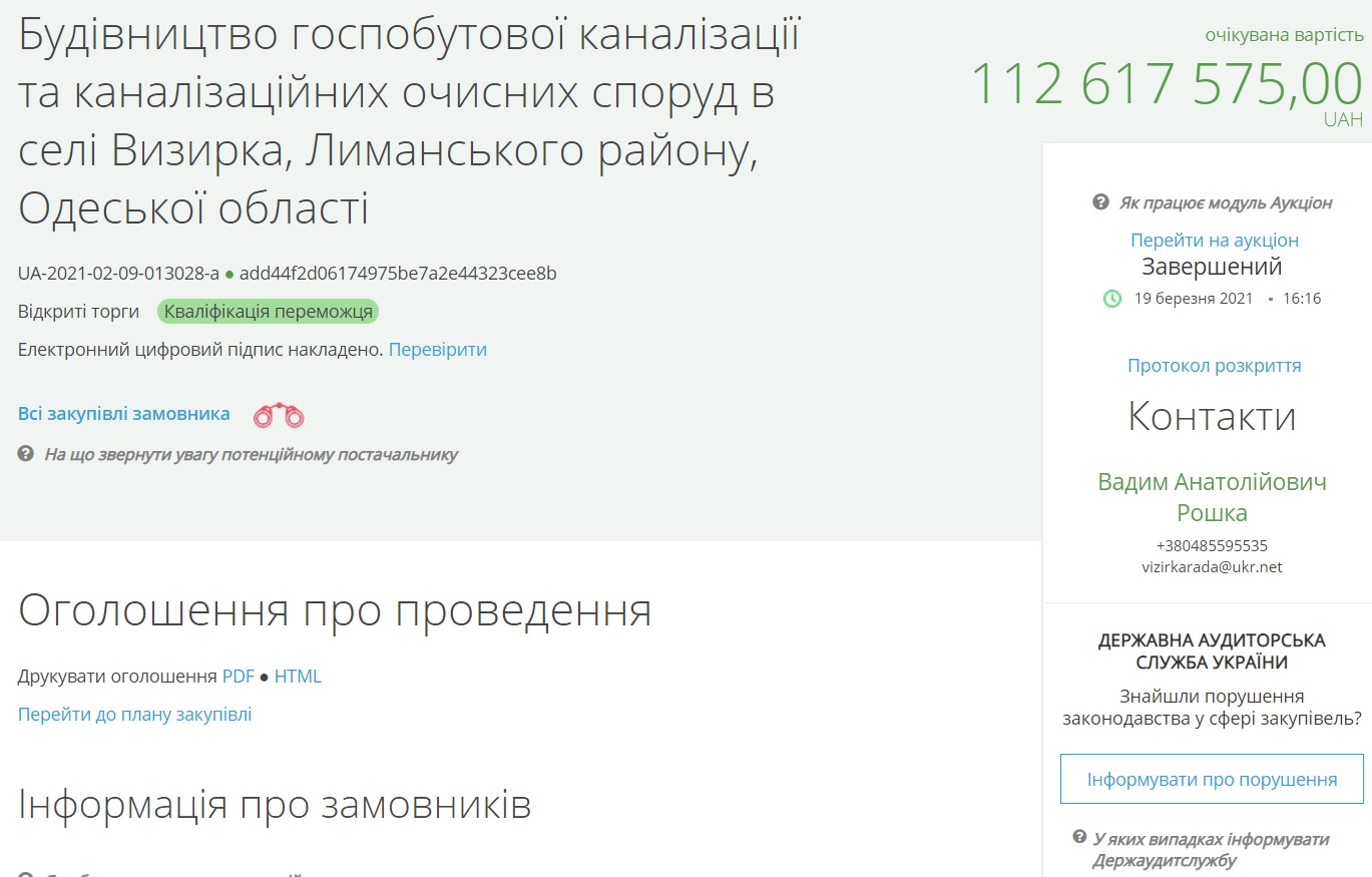Визирська сільська рада Лиманського району Одеської області провела тендер для обрання компанії яка побудує господарсько-побутову каналізацію та каналізаційні очисні споруди в селі Визирка.