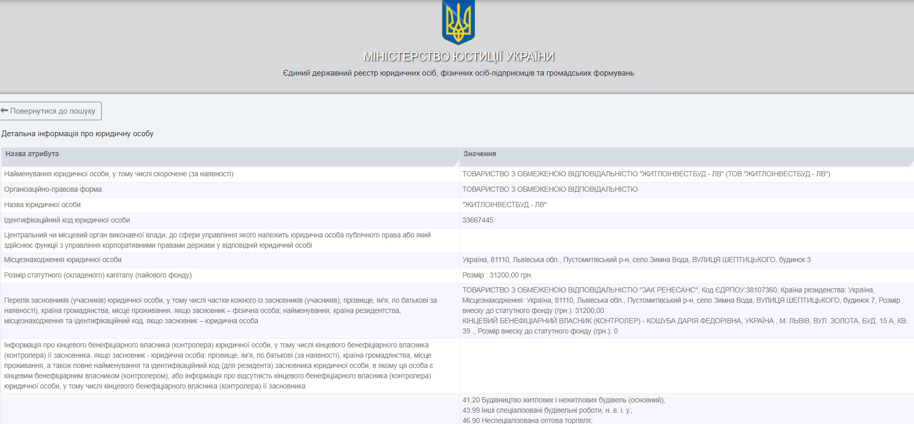 Згідно єдиному реєстру юридичних осіб фірма «Житлоінвестбуд-ЛВ» зареєстрована 2005 року в с. Зимна Вода Пустомитівського району. Її засновником є ТОВ «ЗАК Ренесанс», яким наразі володіє львів’янка Дарія Кошуба.