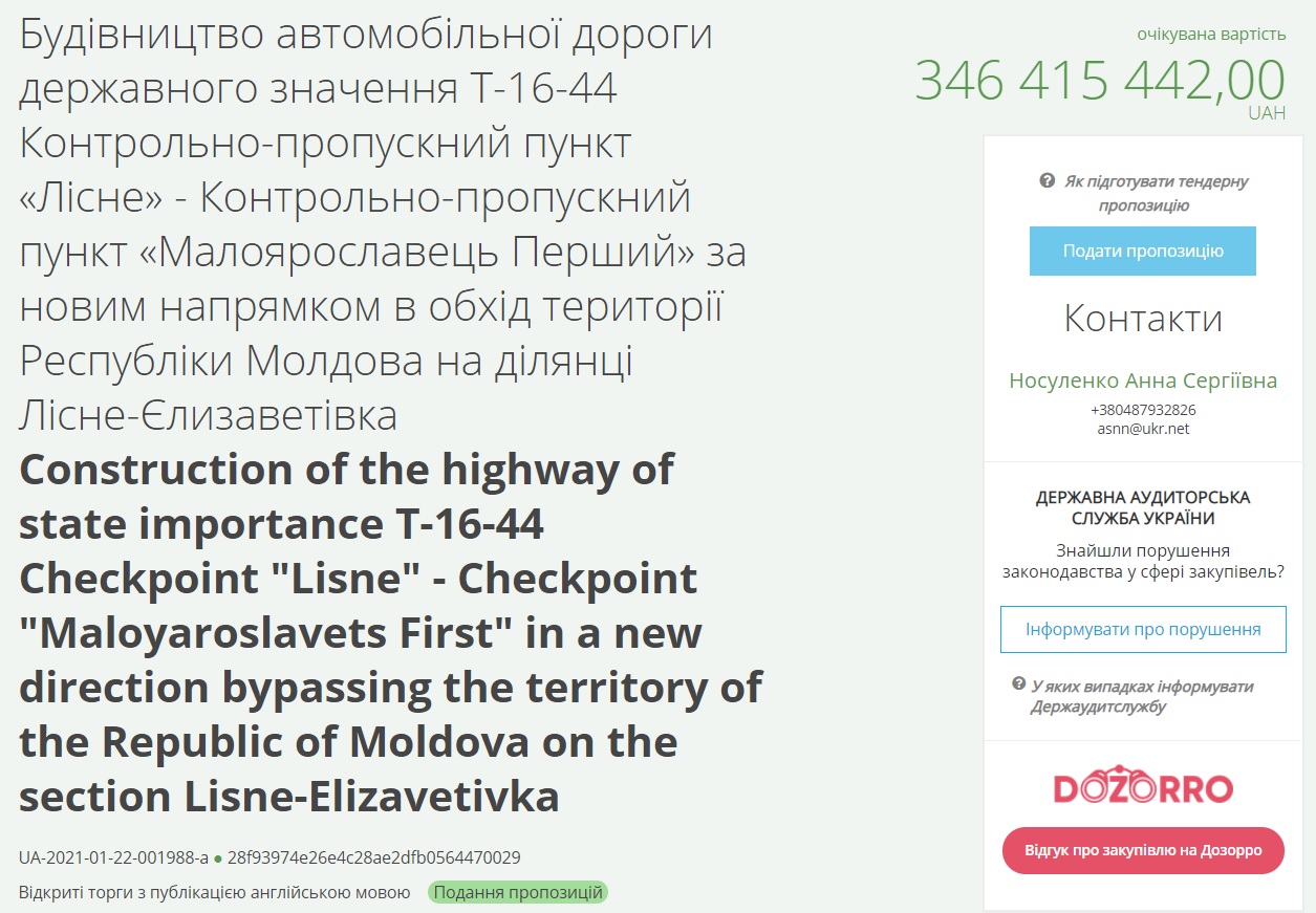 Як зазначається в системі електронних закупівель Prozorro, тепер йдеться про новий напрямок в обхід території Республіки Молдова на ділянці Лісне-Єлизаветівка.