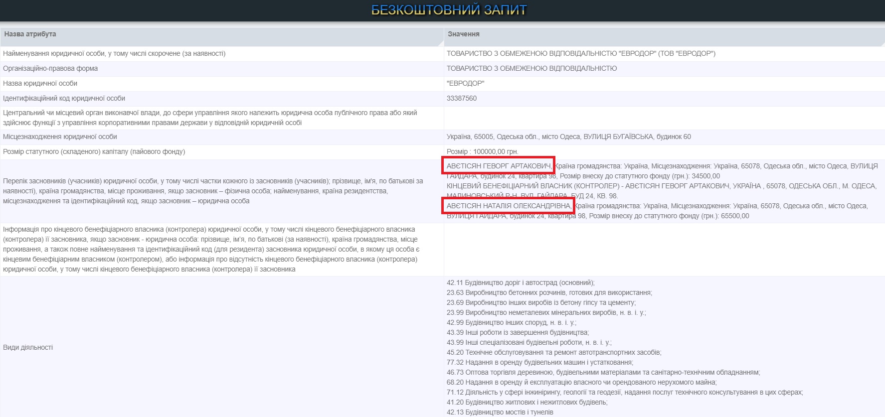 Згідно єдиному реєстру юридичних осіб, фізичних осіб-підприємців та громадських формувань, власником ТОВ «Євродор» є Геворг і Наталія Аветисяни. Геворг Аветисян - син ексдепутата Ізмаїльської районної ради Артака Аветисяна.