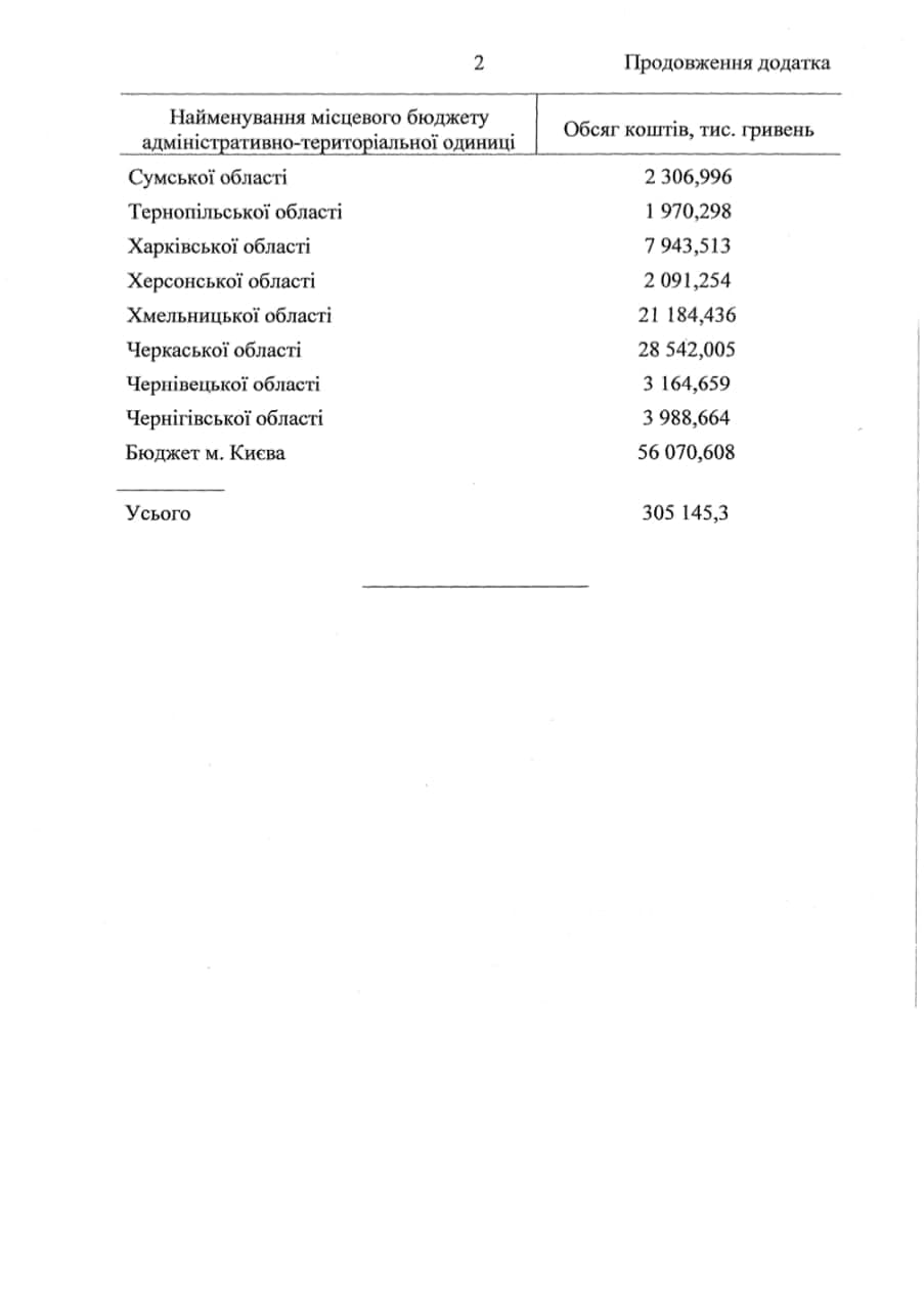 В рамках розподілу найбільше грошей було спрямовано до Дніпропетровської (160 млн грн), м. Києва (133,56 млн грн), Одеської (109,99 млн грн) та Харківської (109,84 млн грн) областей.