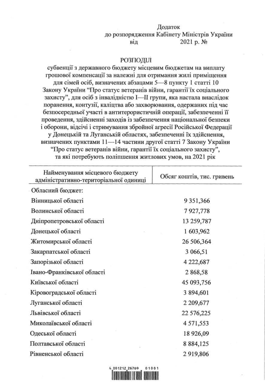 І нарешті Кабінет міністрів України розподілив 50 мільйонів гривень субвенції на виплату грошової компенсації за належні для отримання жилі приміщення для деяких категорій осіб, які брали участь у бойових діях на території інших держав, а також членів їх сімей на 2021 рік.