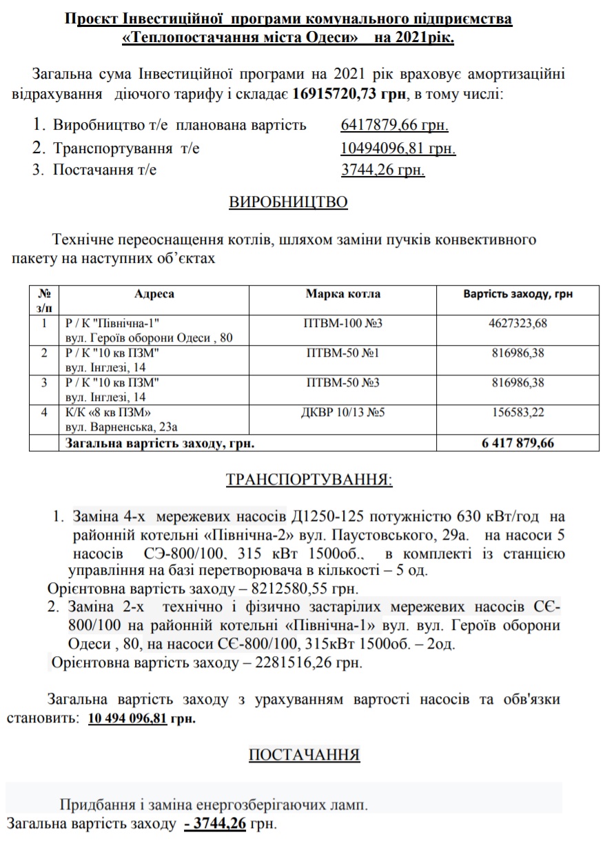 Хоча у 2020 році КП «Теплопостачання міста Одеси» отримало 758 мільйонів гривень з міського бюджету, з яких 650 - у вигляді фінансової допомоги, і тільки 108 млн грн пішло на капітальні витрати.