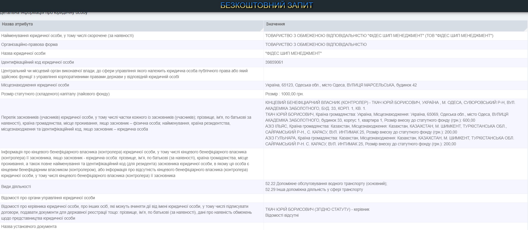 Згідно з реєстром юридичних осіб ТОВ Fides Ship Management засноване в 2015 році громадянами Казахстану Ільясом и Гульнарою Азіс, а також одеситом Юрієм Ткачем, який також зазначений в реєстрі як директор компанії.