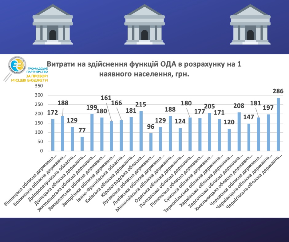 Найбільші управлінські витрати ОДА в розрахунку на одиницю наявного населення утворилися в Чернігівській (286,00 грн), Кіровоградській (215,00 грн), в Сумській та Херсонській областях (по 205,00 та 208 грн відповідно).
