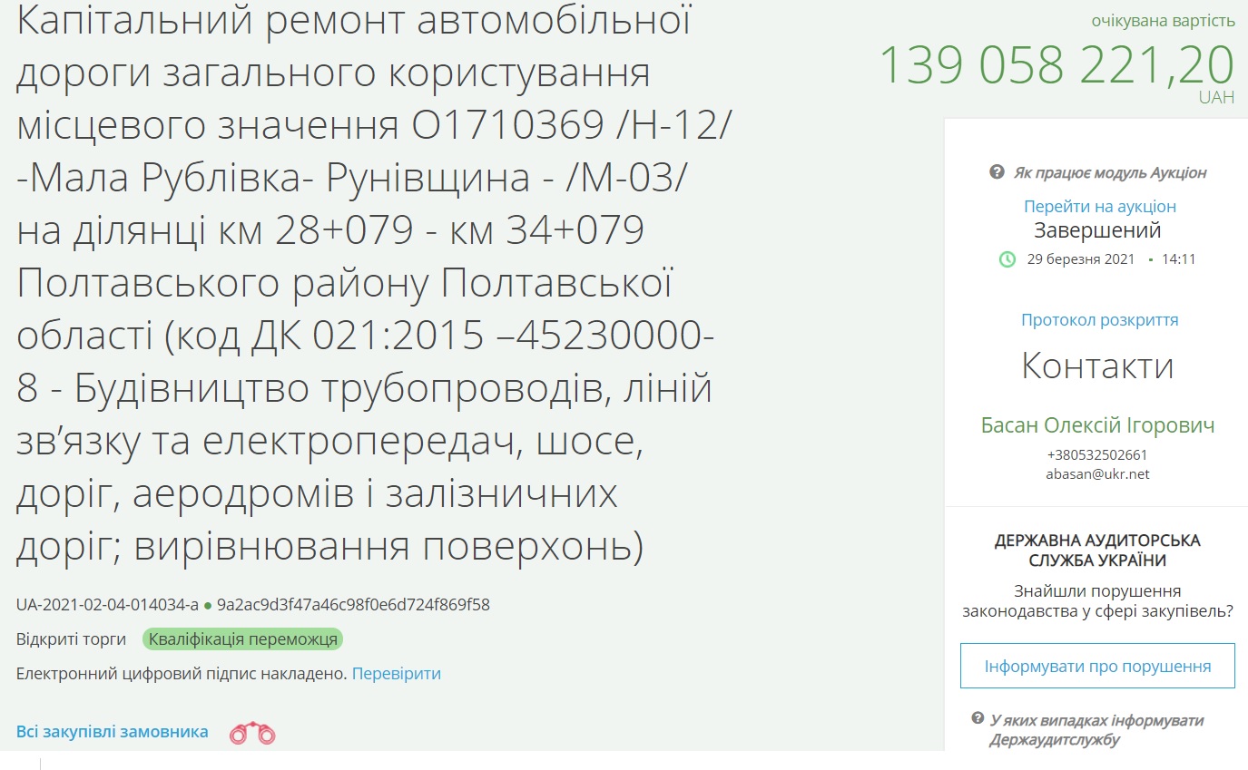 Державне підприємство «Агентство місцевих доріг Полтавської області» провело тендер для обрання підрядника, якому заплатять за капітальний ремонт шести кілометрів дороги загального користування місцевого значення Н-12 - Мала Рублівка - Рунівщина - М-03.